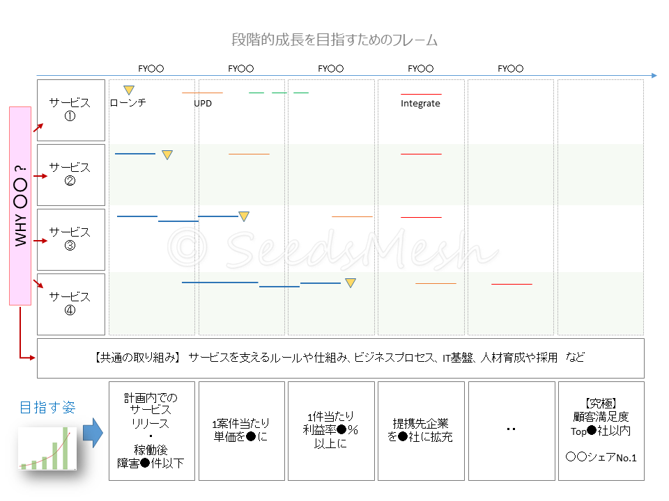 事業構想ができてからローンチまでは、施策の企画やプロジェクト計画と共通項が多いためここでは割愛しますが、 サービスリリースの場合、お客様にサービスを供給する共通基盤(サービスフレーム)や実際のオペレーションを支える ルールや仕組みづくり、人材育成や採用などもサービスの構築とは別に必要となります。