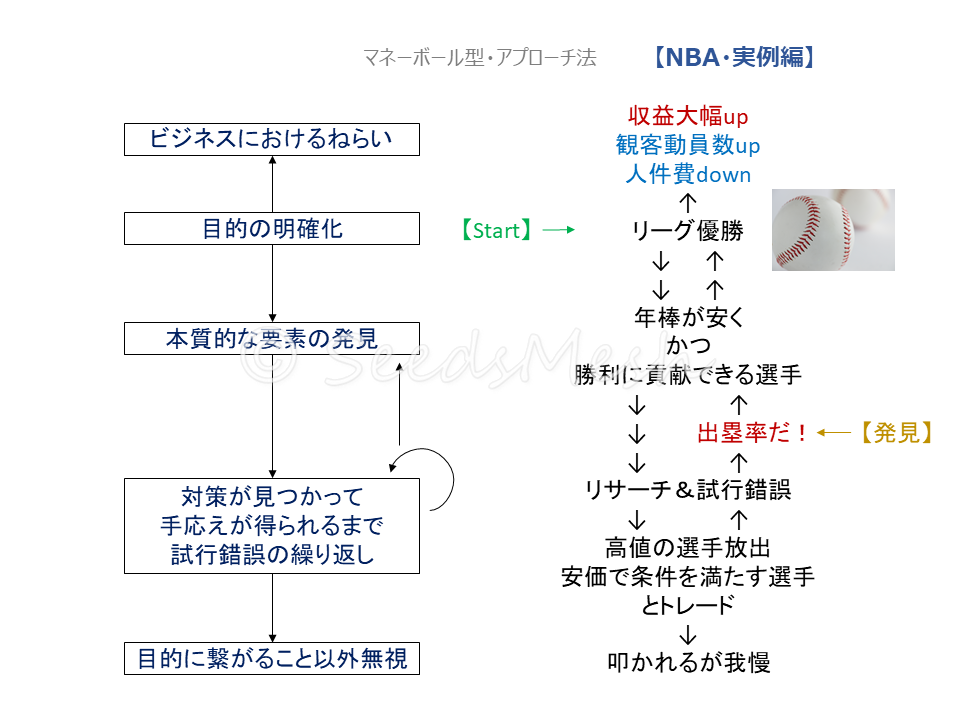 こうした段階的成長をマネージしていく上では、刻々と変化する状況を把握しつつも、虎視眈々と目指す姿を実現していく 目的志向が大切になります。下記は、映画化された「マネーボール」を参考に、目的志向のアプローチ法をモデル化したものです。 例示はNBAのものですが、このアプローチ法は事業の展開においても十分使えます。
