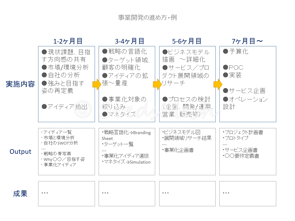 弊社の支援においては、事業を支える意志や動機の明確化をはじめ、アイディア発掘~事業構想、実行プランの策定、 POC、サービス基盤構築、そしてローンチに至るまでの一連のプロセスをトータルにサポート(*1)させていただきます。