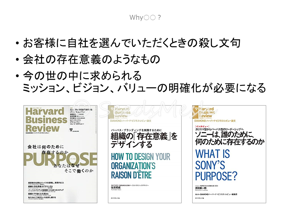 冒頭にも書きましたが、事業創造に欠かせない事柄はマインド(事業を進める想いや動機、意志)です。 自分たちは何者か/なぜこの事業を成し遂げることができるのか という起業家のプレゼンなどでよく見かけるあれです。 比較的大きな企業であれば「Why○○?」(○○は企業名)などのようなスライドが提案資料の中にあって、自社の強みや 存在意義が書かれています。
